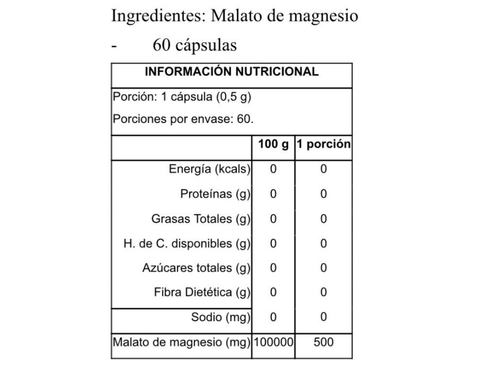 Malato de Magnesio , Cápsula vegetal : HPMC ( hidroxipropilmetilcelulosa